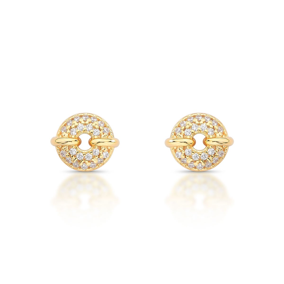 Com design circular cravejado em zircônias e barra dourada atravessando o centro, este brinco folheado a ouro 18k é sinônimo de elegância geométrica e brilho sofisticado.Características: