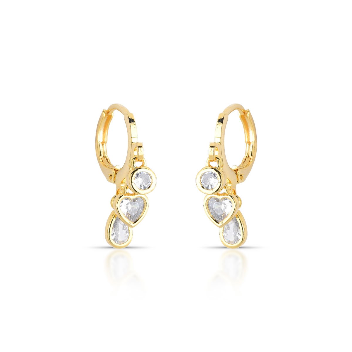 Brinco argola clic com trio pendente de zircônias lapidadas em diferentes formatos, oferecendo luminosidade e destaque ao visual.Folheado a ouro 18k, é uma peça leve, sofisticada e perfeita para combinar com outros acessórios delicados.