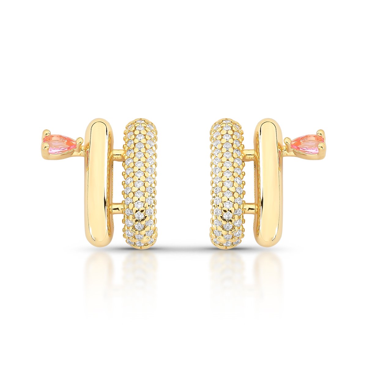 Brinco curvado folheado a ouro 18k com duas estruturas: uma parte lisa e outra totalmente cravejada com zircônias cúbicas.O toque final fica por conta da zircônia colorida em formato de gota, que traz charme e autenticidade à peça.