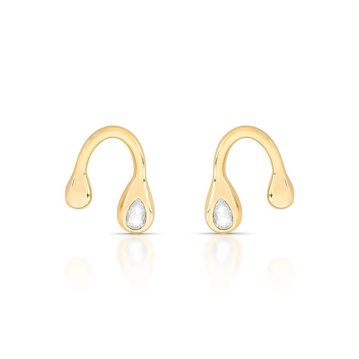 Brinco de formato curvo com gotas nas extremidades e acabamento polido em ouro 18k.Destaque para a zircônia cúbica em formato de gota que adiciona brilho delicado à peça.