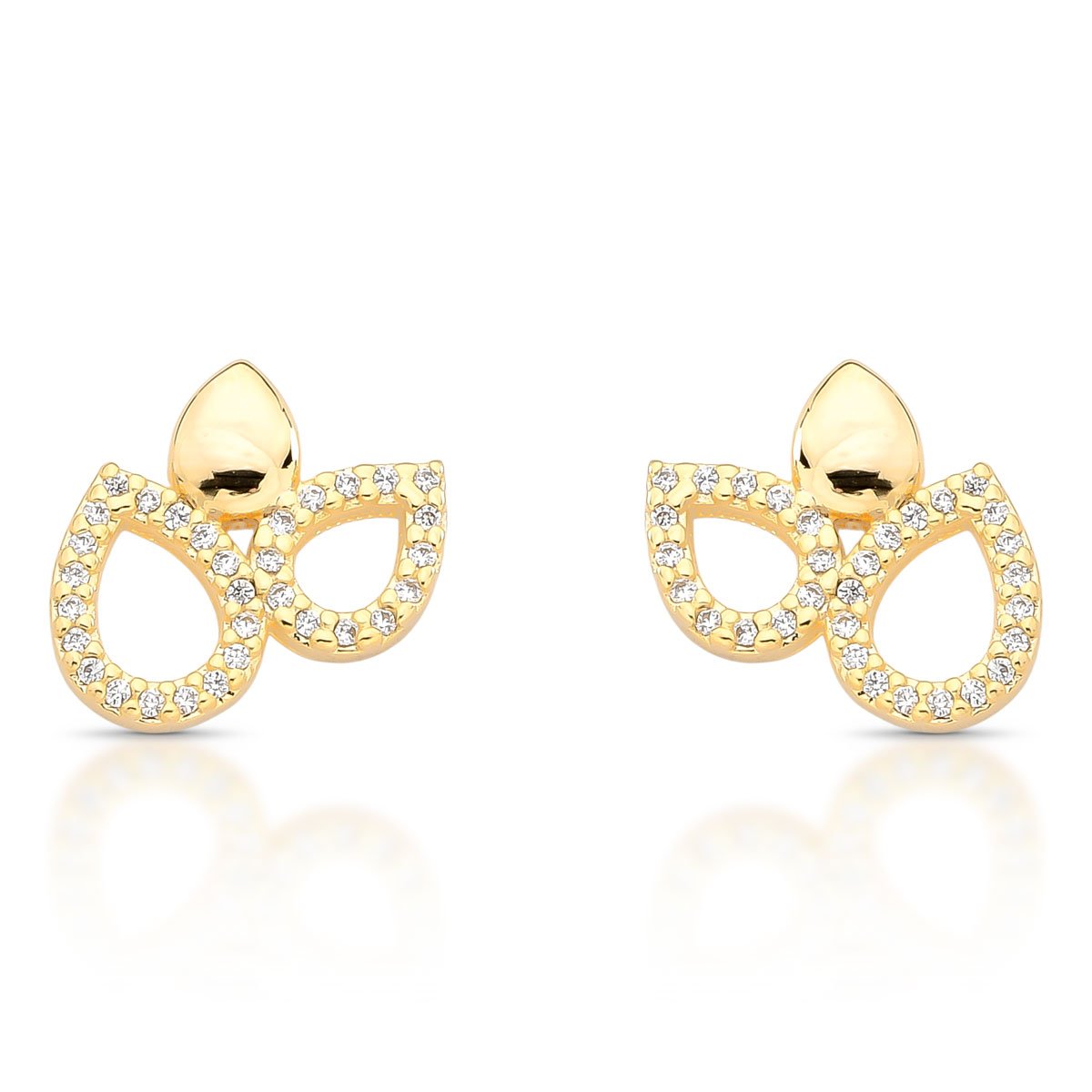 Brinco com trio de gotas em composição orgânica, sendo duas cravejadas com zircônias e uma polida.Folheado a ouro 18k, combina brilho, leveza e harmonia em uma peça encantadora.