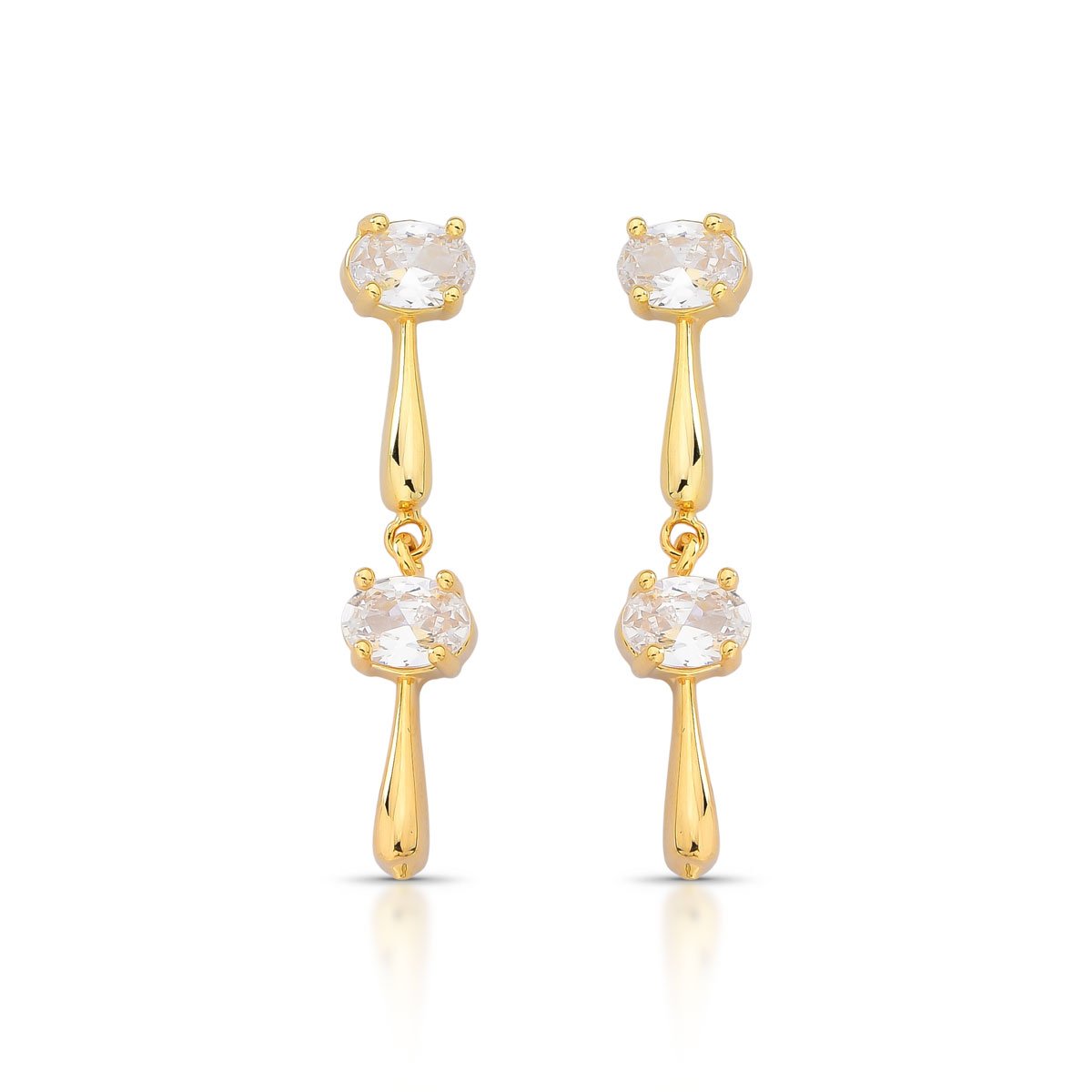 Brinco longo com zircônias ovais brancas e estrutura articulada, folheado a ouro 18k.Seu design elegante e fluido destaca a luminosidade das pedras em movimento leve e sofisticado.