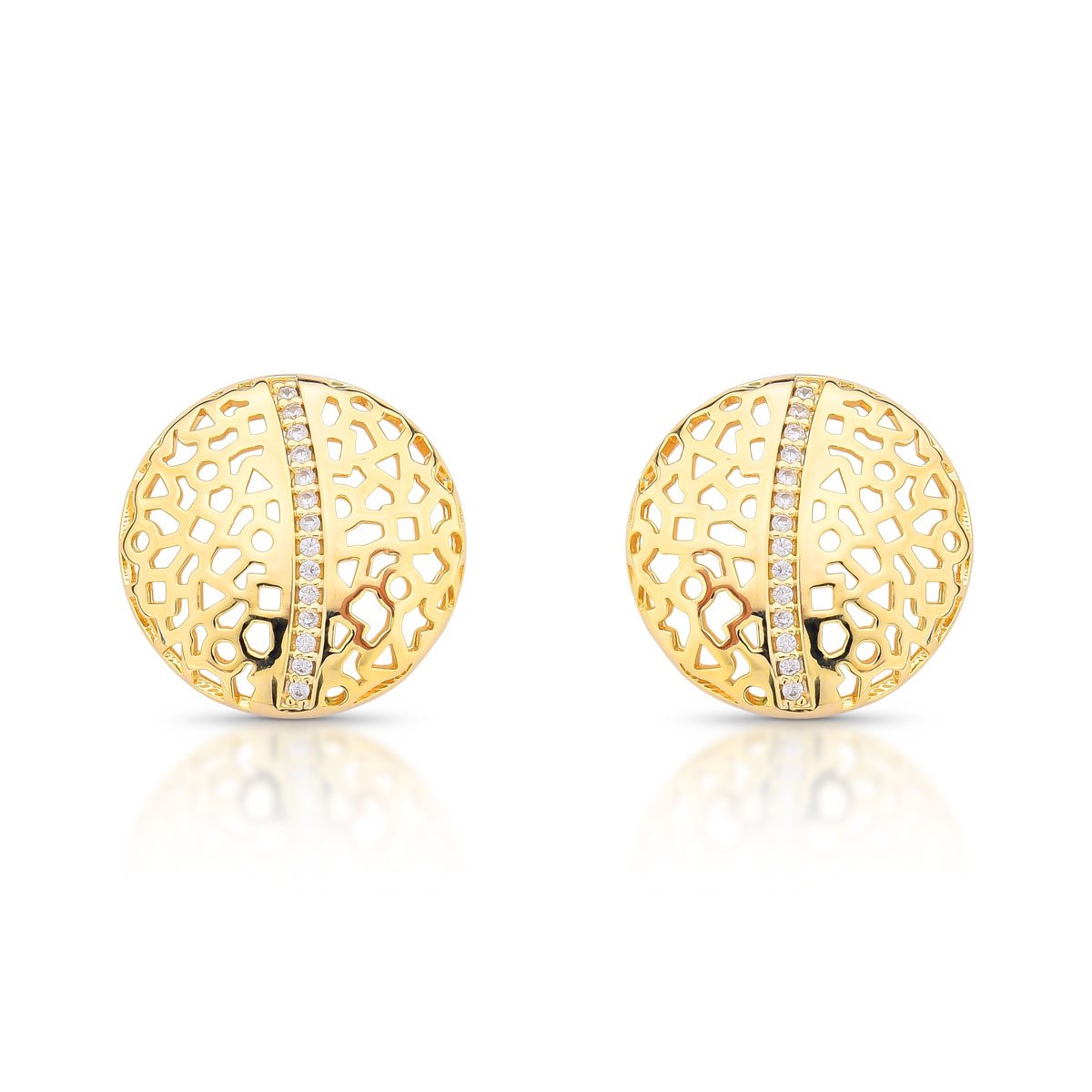 Brinco redondo com acabamento rendado vazado e faixa central cravejada com zircônias, folheado a ouro 18k.Um design elegante que une delicadeza e brilho com sofisticação.