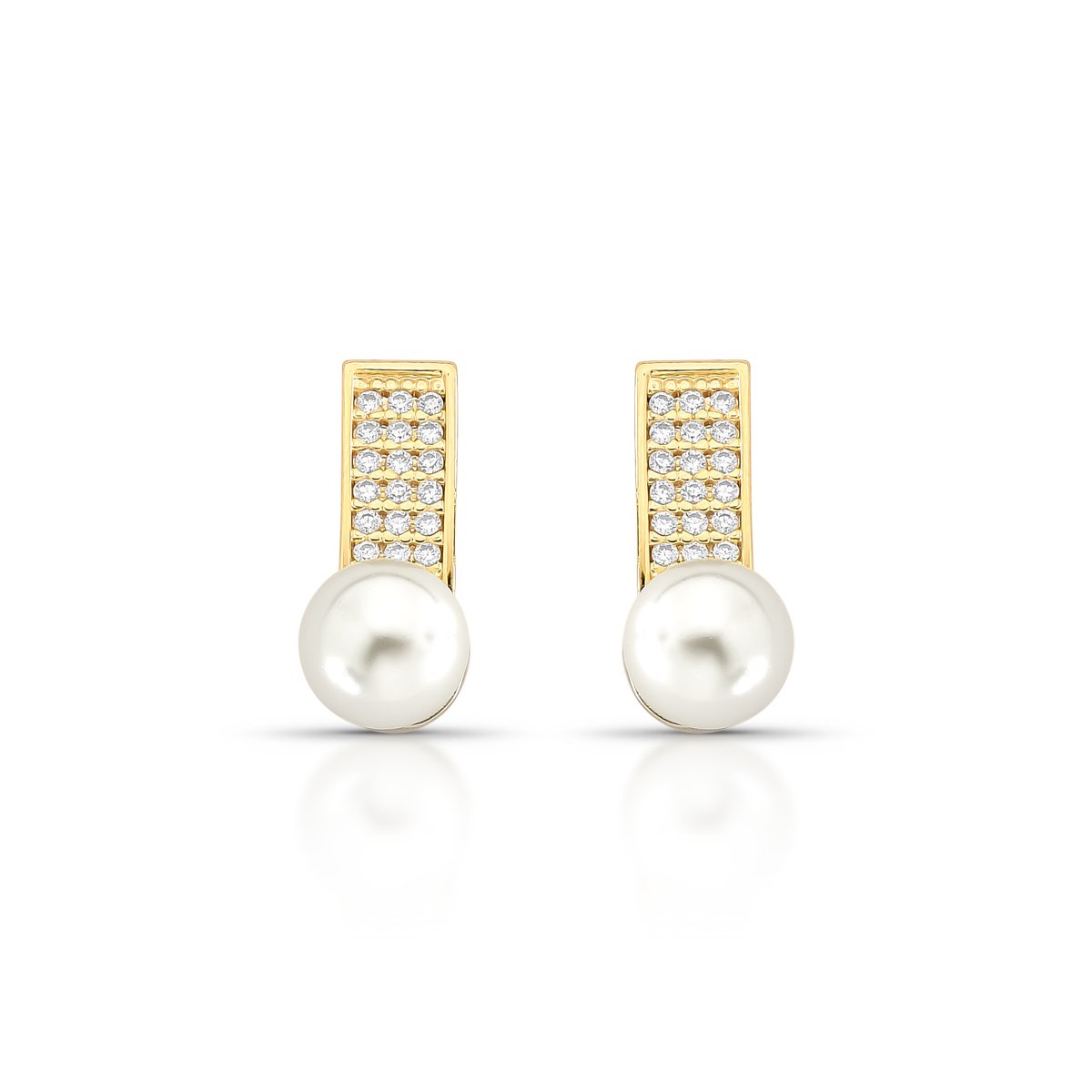 Brinco com design retangular, pérola sintética e zircônias cúbicas cravejadas.Folheado a ouro 18k, traz equilíbrio entre elegância atemporal e estilo contemporâneo.