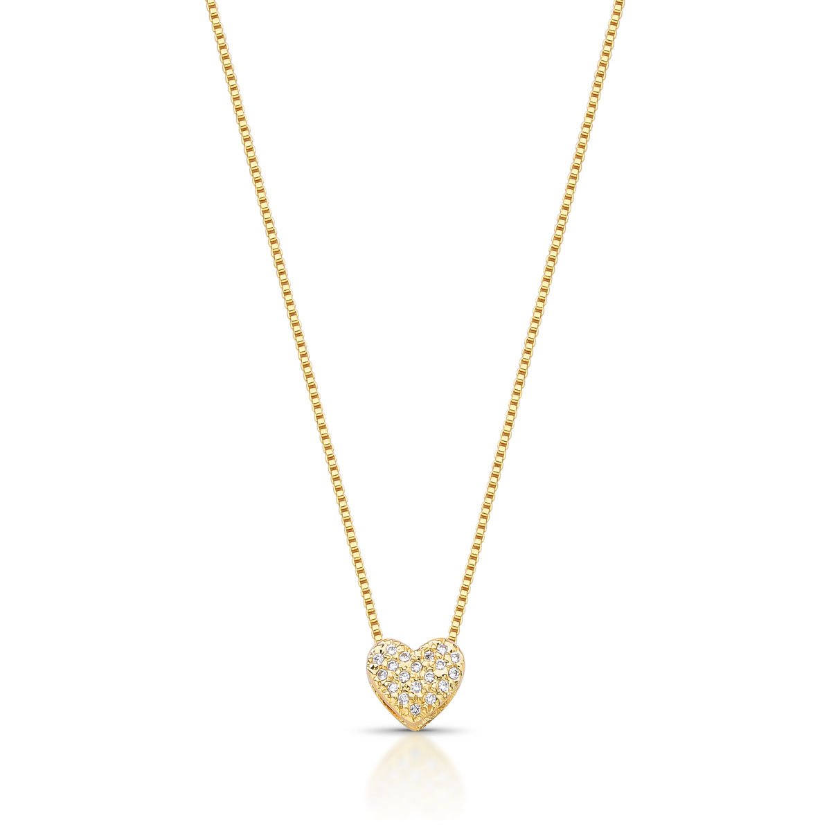 Colar com pingente de coração volumoso cravejado com zircônias.Corrente veneziana folheada a ouro 18k. Um acessório romântico e brilhante para composições sofisticadas e femininas.