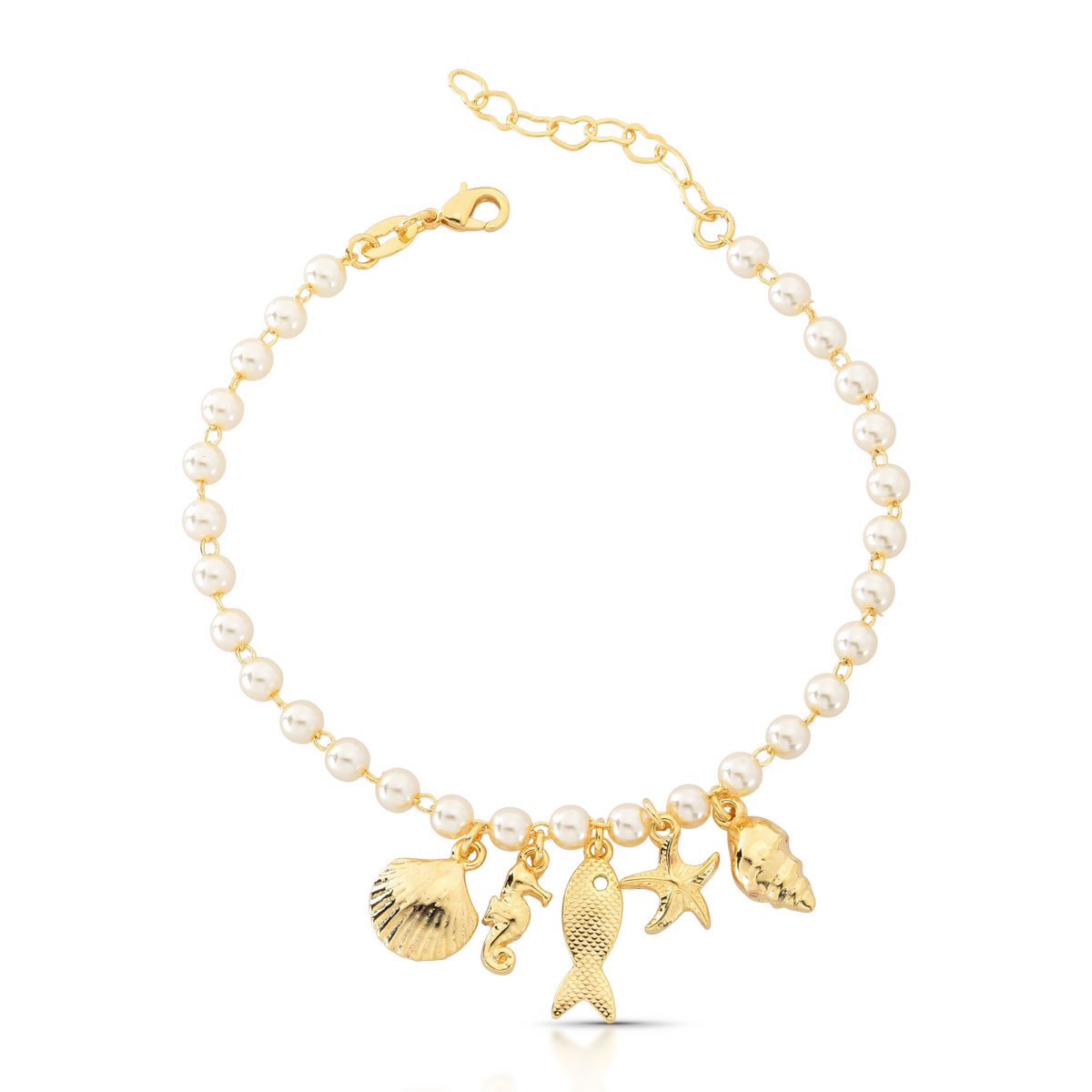 Pulseira com mini pérolas e pingentes de concha, peixe, cavalo-marinho, estrela-do-mar e búzio, todos folheados a ouro 18k.Uma joia com alma praiana que traduz o encanto e a beleza do oceano em cada detalhe.